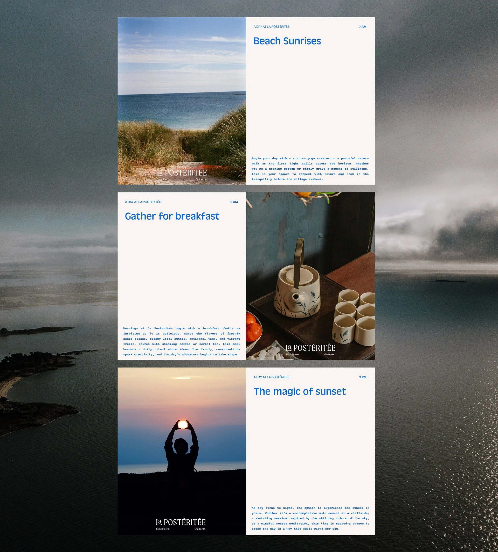 The region in which you find La Postéritée is steeped in layers of history stretching back over 8,000 years. In more recent times the building used to serve as the local post office of Saint Pierre Quiberon. That storyline felt an important reference for the logo. Vintage French stamps and the typography that decorated them served as the inspiration for a word mark with both personality and heritage.